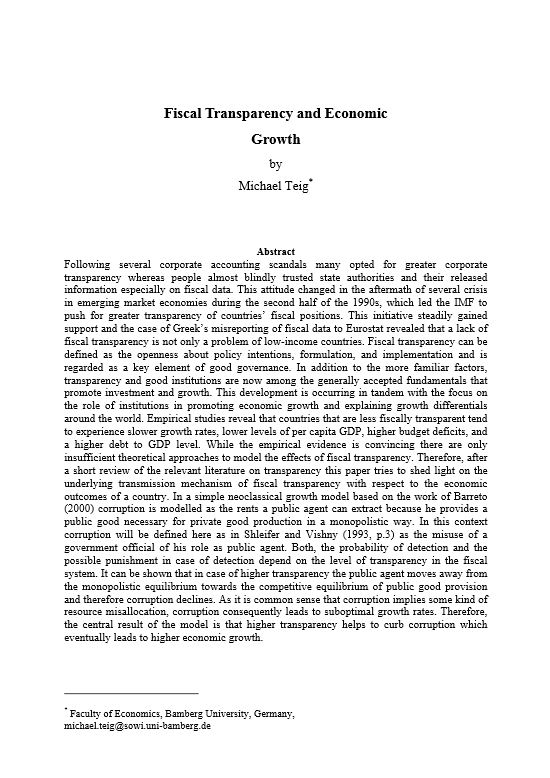 Following several corporate accounting scandals many opted for greater corporate transparency whereas people almost blindly trusted state authorities and their released information especially on fiscal data. This attitude changed in the aftermath of several crisis in emerging market economies during the second half of the 1990s, which led the IMF to push for greater transparency of countries’ fiscal positions. This initiative steadily gained support and the case of Greek’s misreporting of fiscal data to Eurostat revealed that a lack of fiscal transparency is not only a problem of low-income countries. Fiscal transparency can be defined as the openness about policy intentions, formulation, and implementation and is regarded as a key element of good governance.