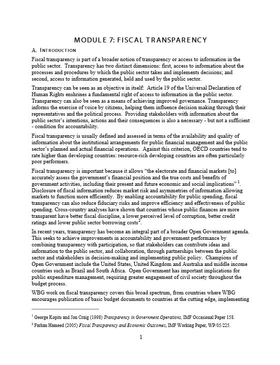 Fiscal transparency is part of a broader notion of transparency or access to information in the public sector. Transparency has two distinct dimensions: first, access to information about the processes and procedures by which the public sector takes and implements decisions; and second, access to information generated, held and used by the public sector. Transparency can be seen as an objective in itself: Article 19 of the Universal Declaration of Human Rights enshrines a fundamental right of access to information in the public sector. Transparency can also be seen as a means of achieving improved governance. Transparency informs the exercise of voice by citizens, helping them influence decision making through their representatives and the political process. Providing stakeholders with information about the public sector’s intentions, actions and their consequences is also a necessary - but not a sufficient - condition for accountability...